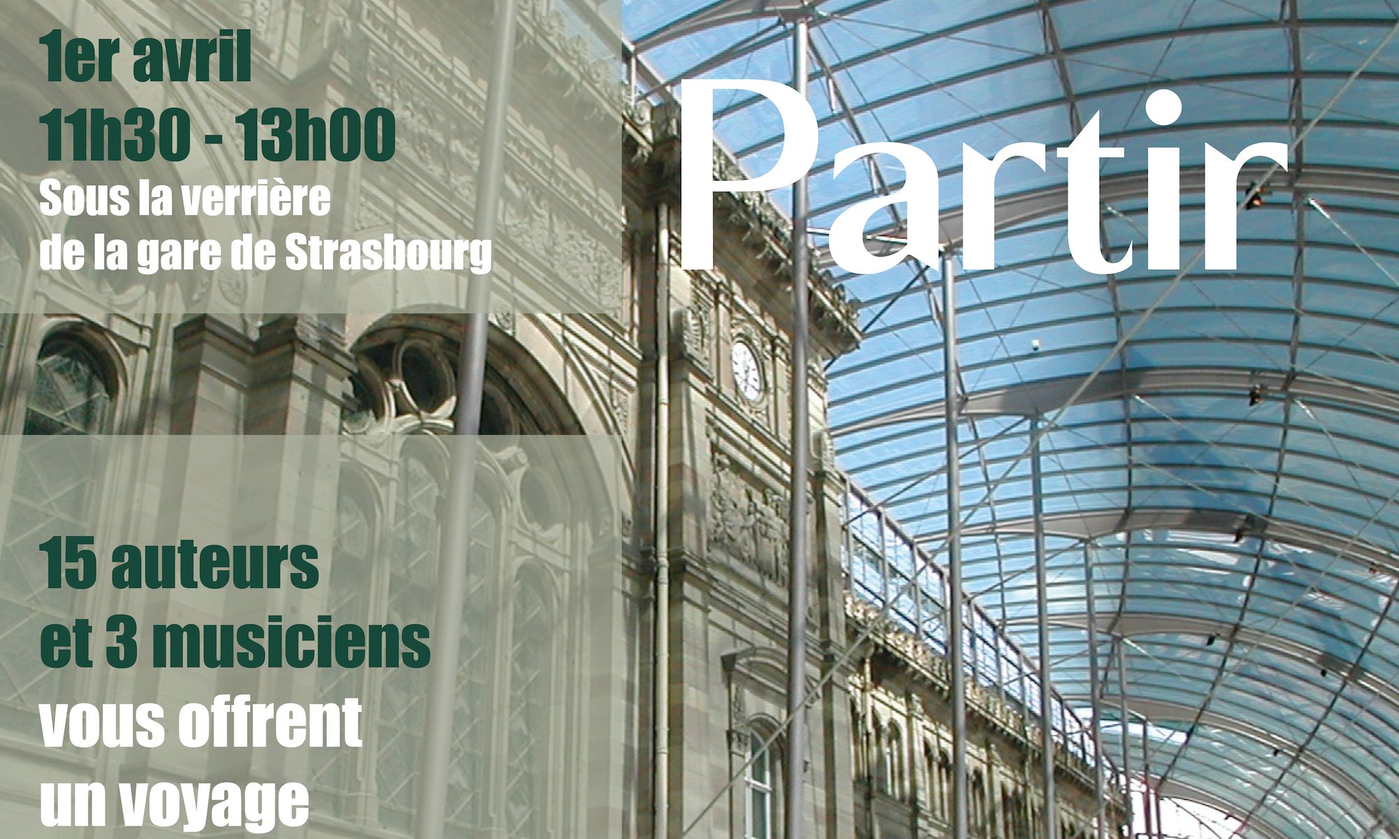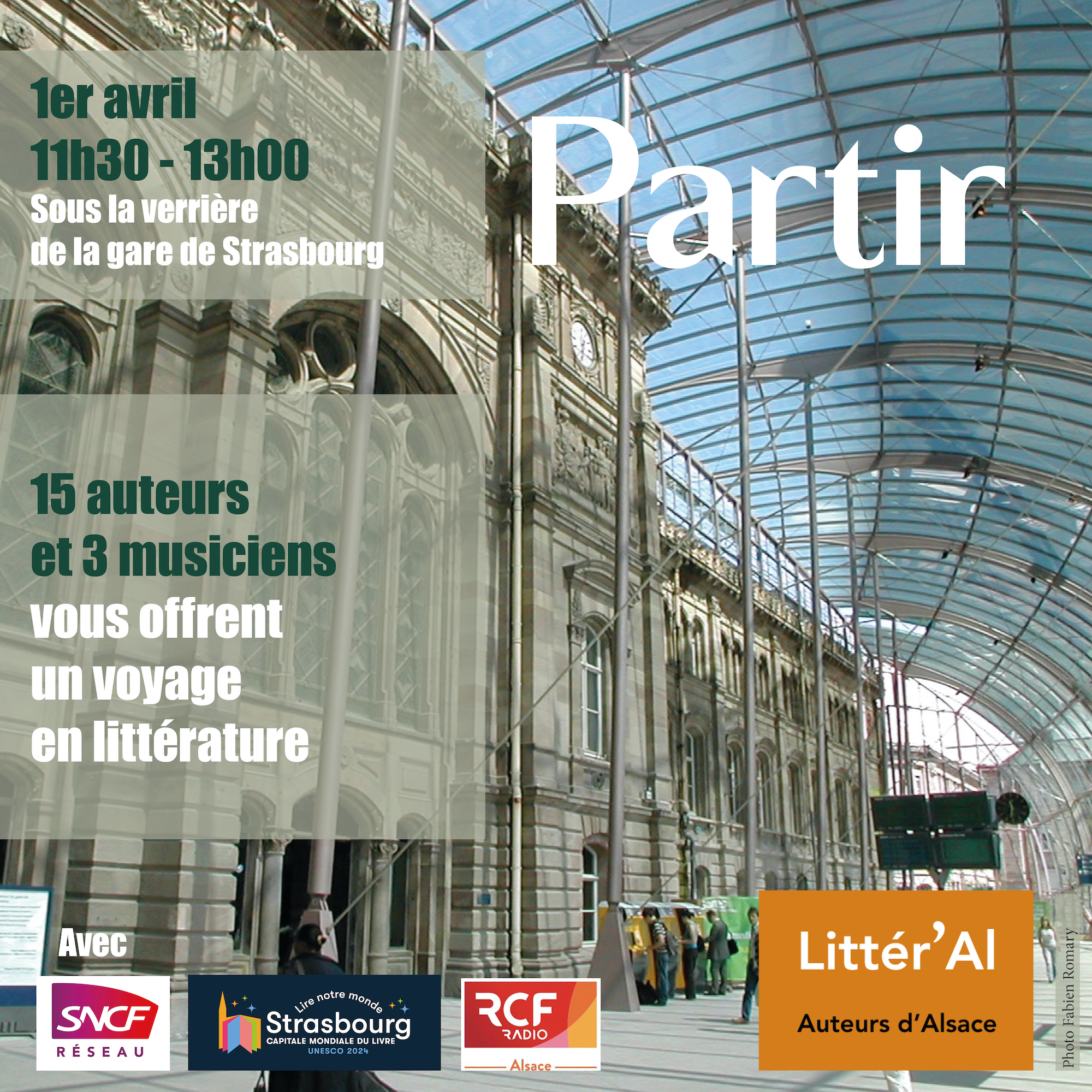 Le 1er avril 2025 de 11h30 à 13h, l’association Littér’Al est fière de proposer un spectacle de lecture littéraire, comme un voyage décomposé en étapes de 5 minutes, idéal pour les gens qui ont un train à prendre comme pour ceux qui voudront prendre place sur les chaises mises à leur disposition, pour tous ceux qui prennent ou ne prennent pas le train, lecteurs ou pas lecteurs, habitués ou pas des médiathèques ou des librairies, pour entendre les écrivains de l’Eurométropole et d’Alsace lire de leur propre voix.